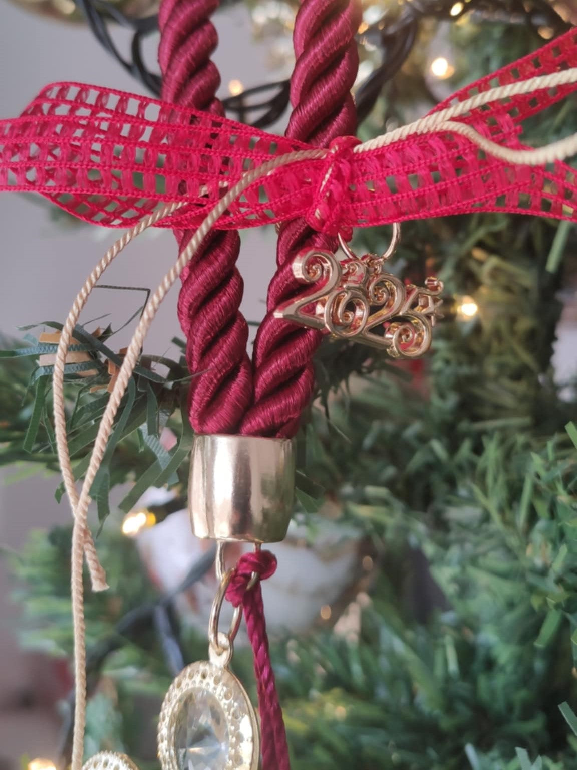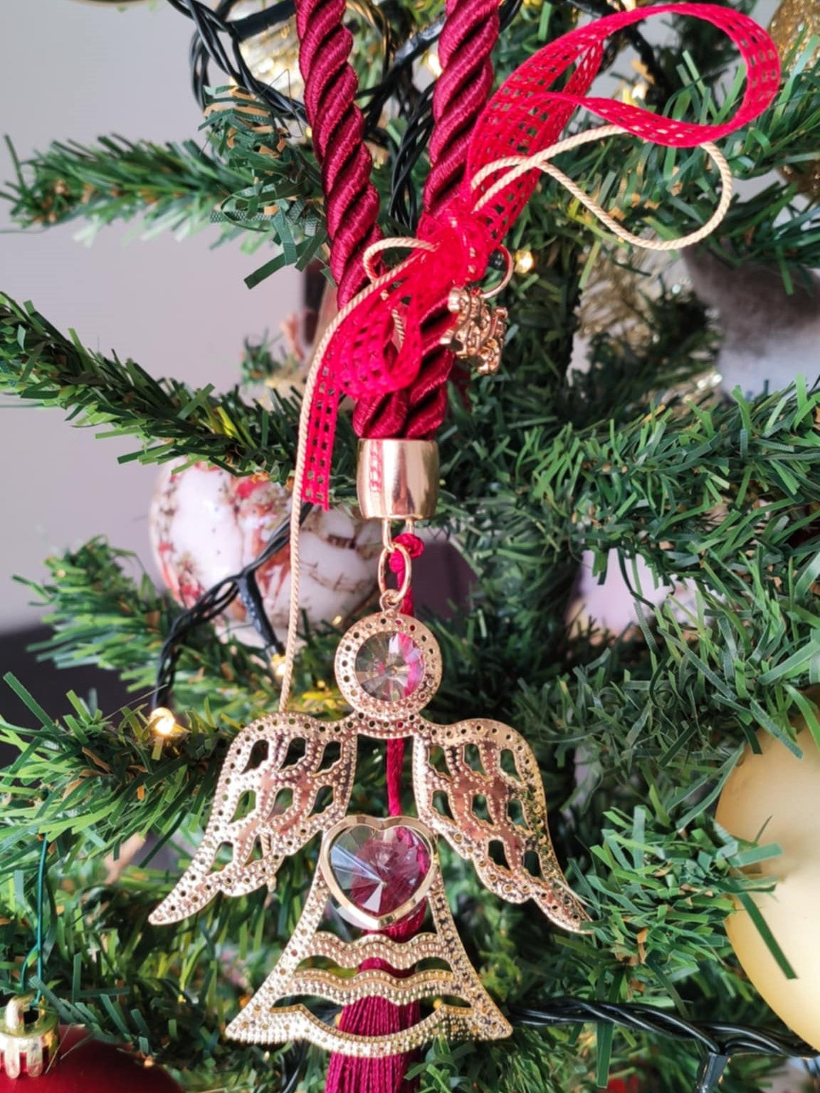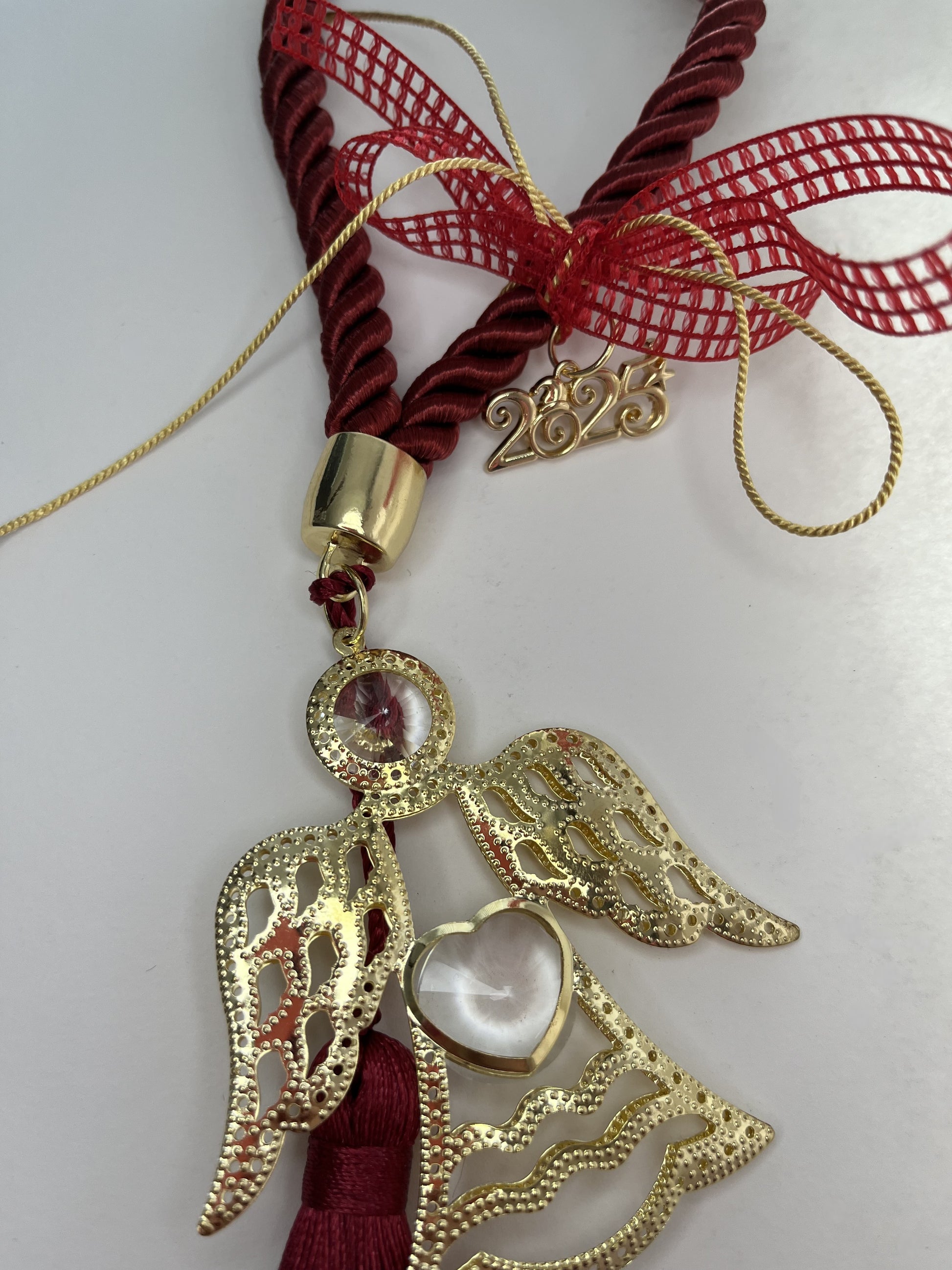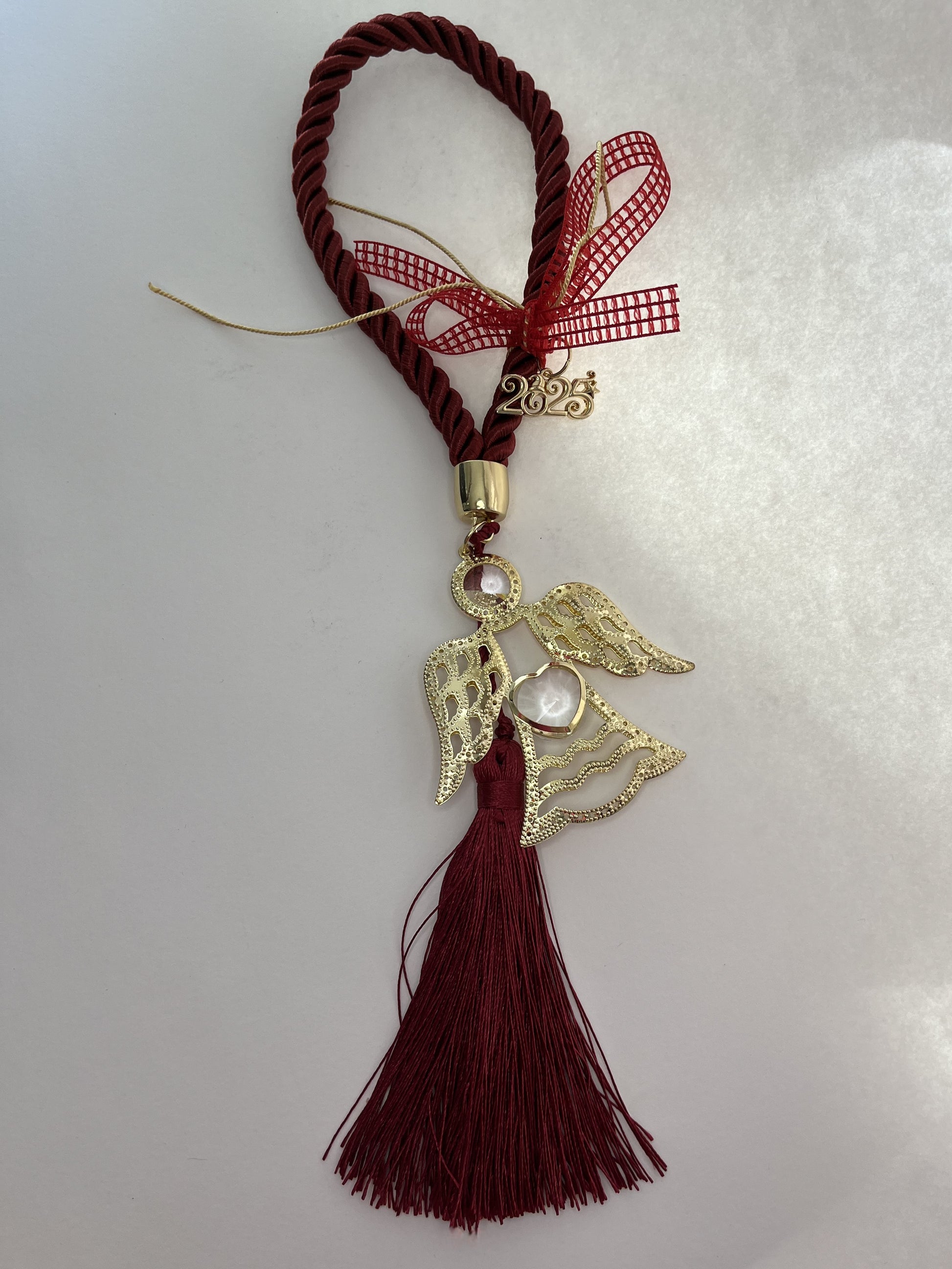 Υποδεχτείτε τη Νέα Χρονιά με αυτό το μοναδικό γούρι με θέμα τον άγγελο. Με κόκκινο στριφτό κορδόνι, μεταλλικό αγγελάκι και κόκκινη φούντα, αυτό το γούρι συμβολίζει ευλογίες και προστασία για τη νέα χρονιά. Στολίζεται με χρυσό και κόκκινο φιόγκο, καθώς και το μεταλλικό στοιχείο "2025", καθιστώντας το ιδανικό δώρο ή ένα ξεχωριστό διακοσμητικό για το σπίτι σας.