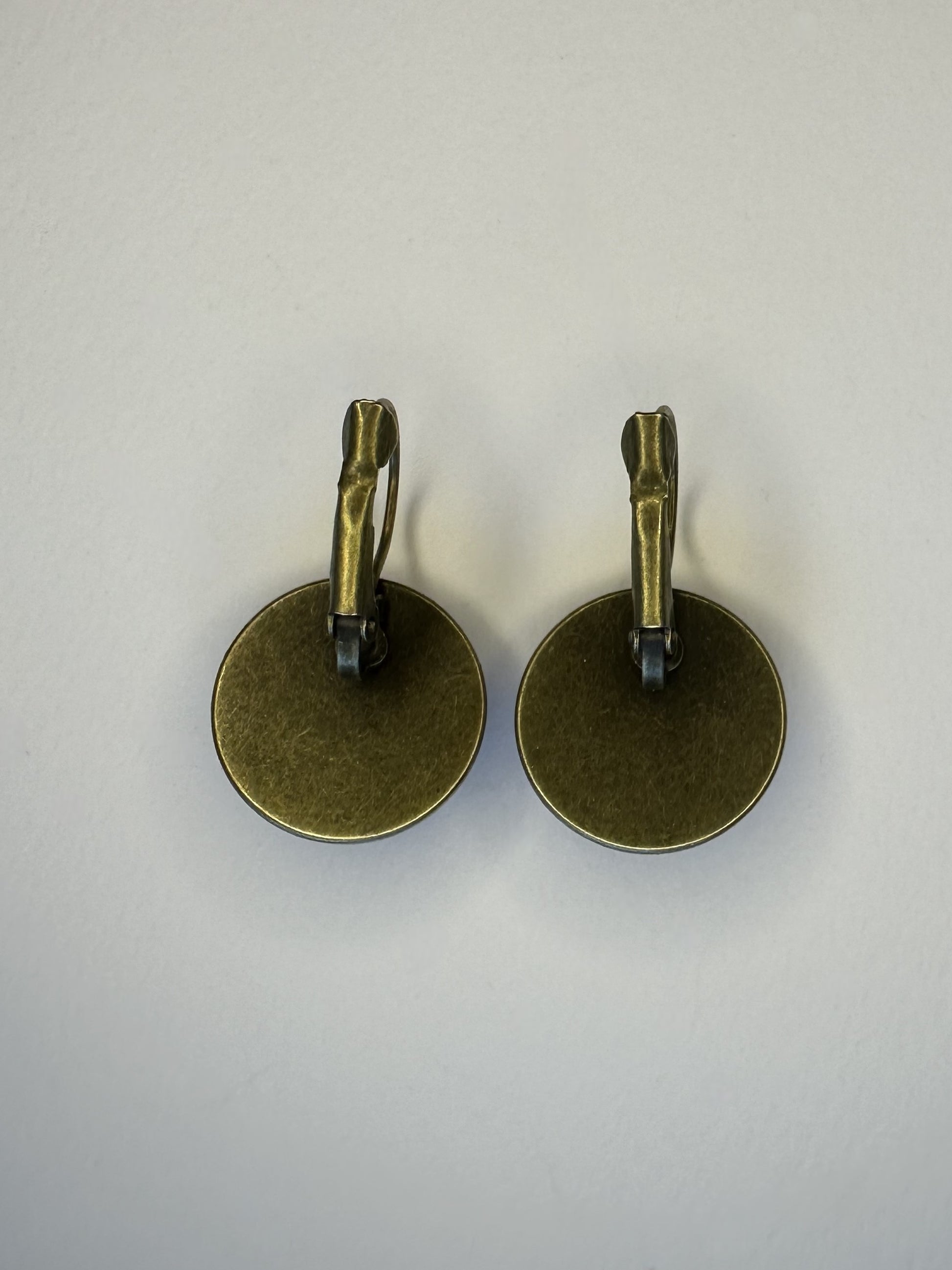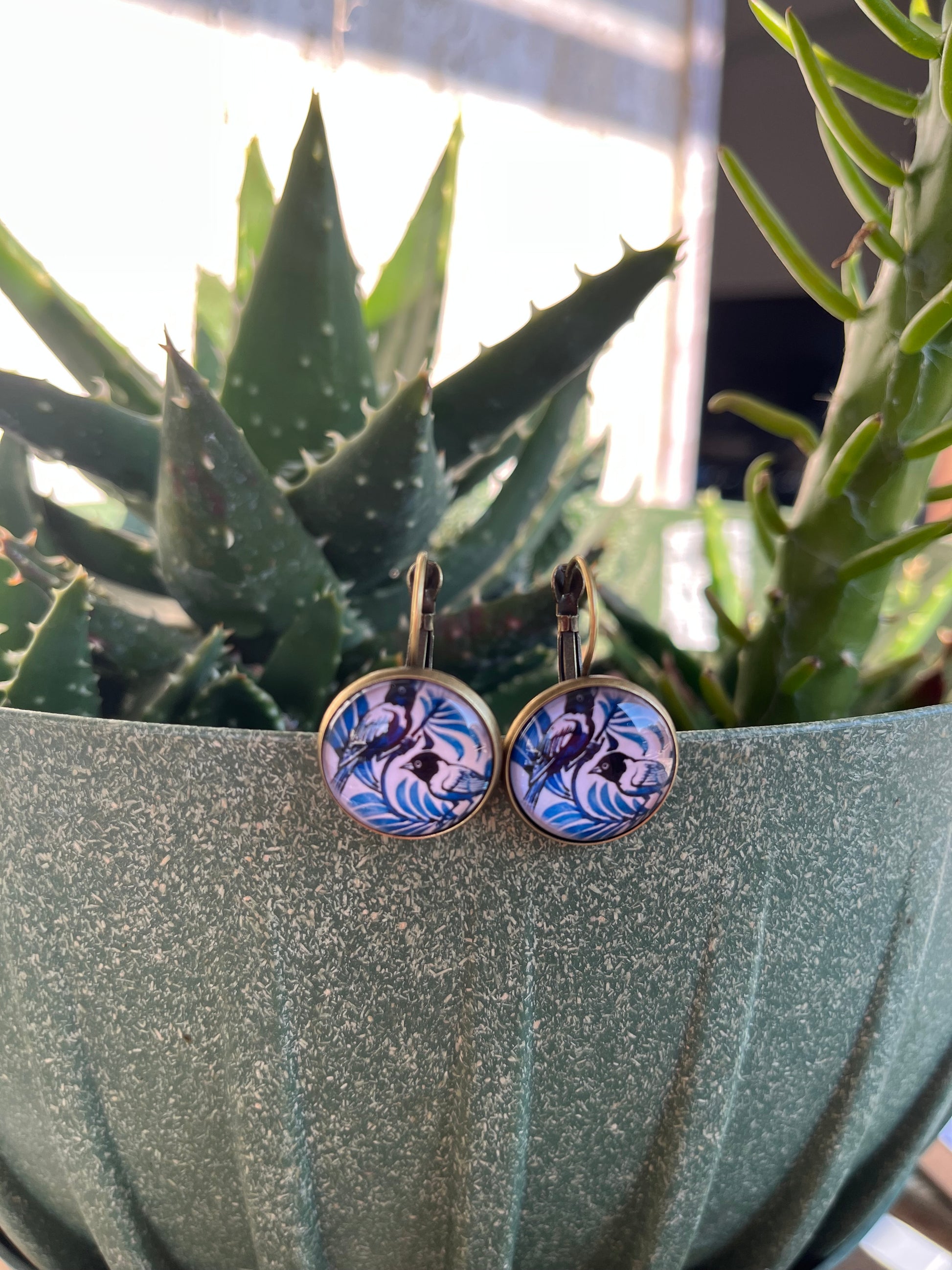 Αυτά τα εντυπωσιακά σκουλαρίκια παρουσιάζουν μια γυάλινη παράσταση με δύο όμορφα πουλιά σε αποχρώσεις του μπλε σε λευκό φόντο. Περιτριγυρισμένα από γοητευτική μπρούντζινη χρυσή σύσταση, προσθέτουν μια φρέσκια πινελιά στην κοσμηματοθήκη σας, ιδανικά για κάθε ντύσιμο.