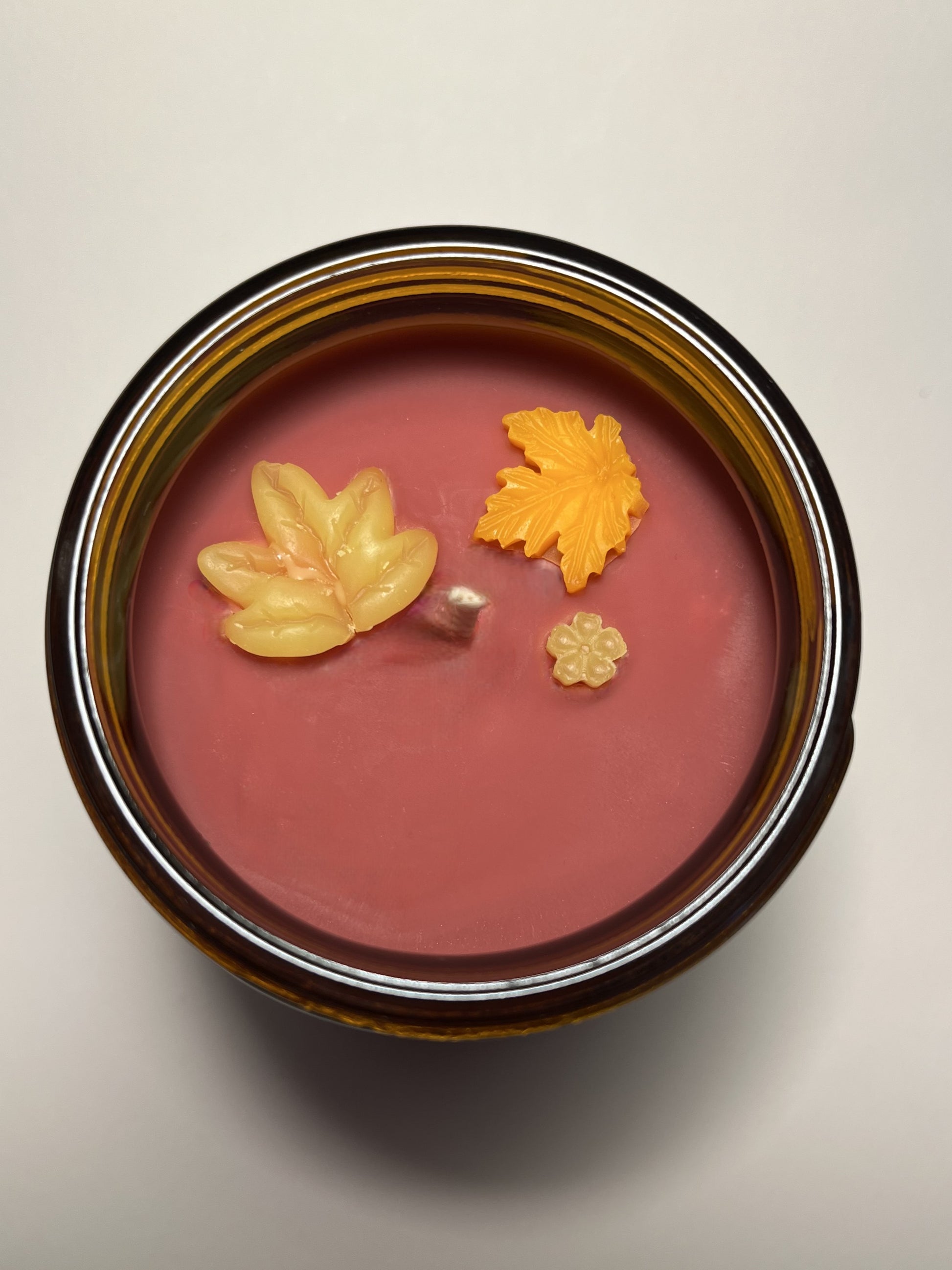 🍁 Σχεδιασμός: Βαθύ κόκκινο κερί με ανάγλυφα διακοσμητικά φύλλα.