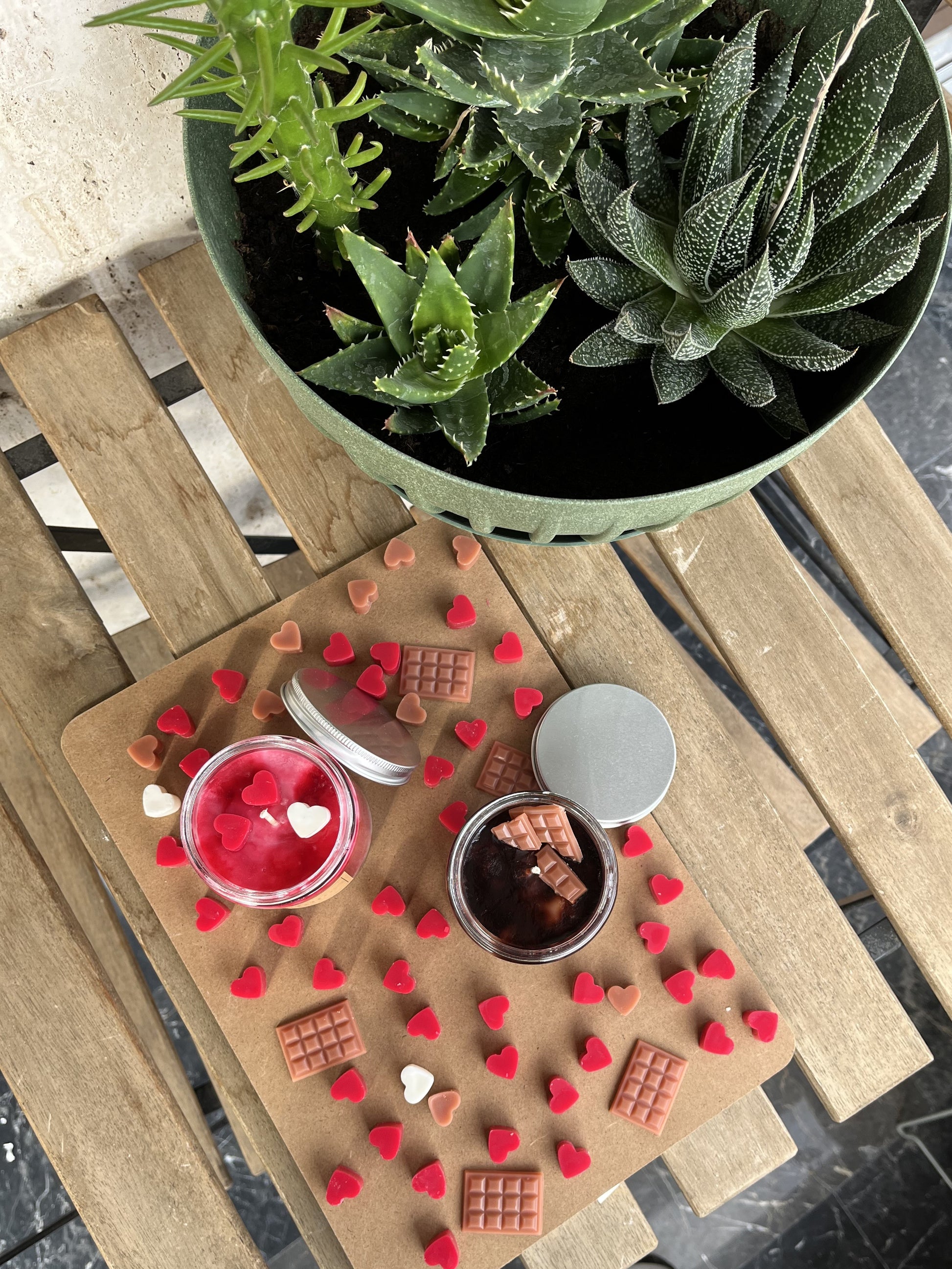 - Σχεδιασμός: Κόκκινο και λευκό κερί με διακοσμητικά κεριά σε σχήμα καρδιάς.