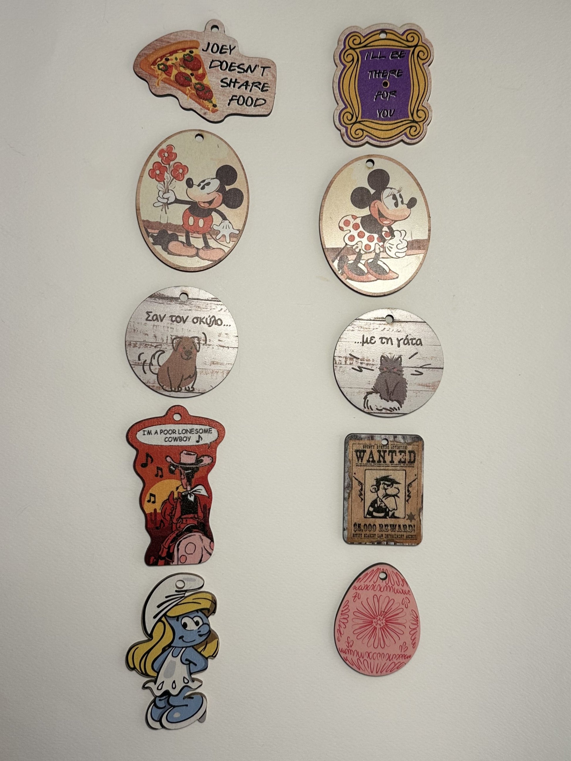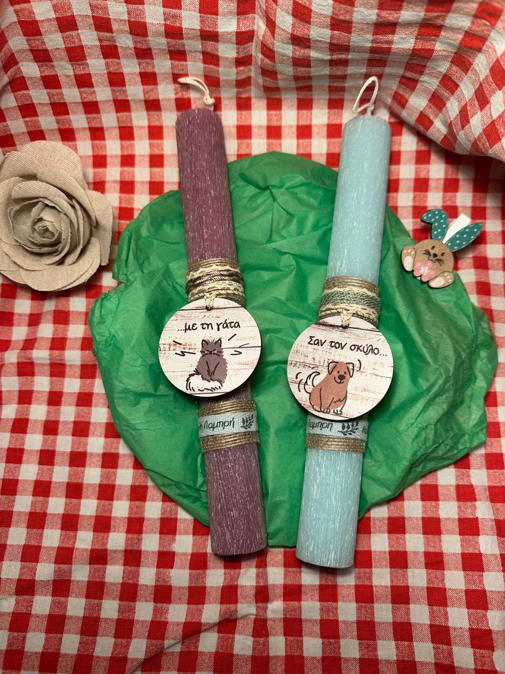 Κάθε λαμπάδα συνοδεύεται από ένα ξύλινο διακοσμητικό, με αστεία, νοσταλγικά ή γλυκά σχέδια: