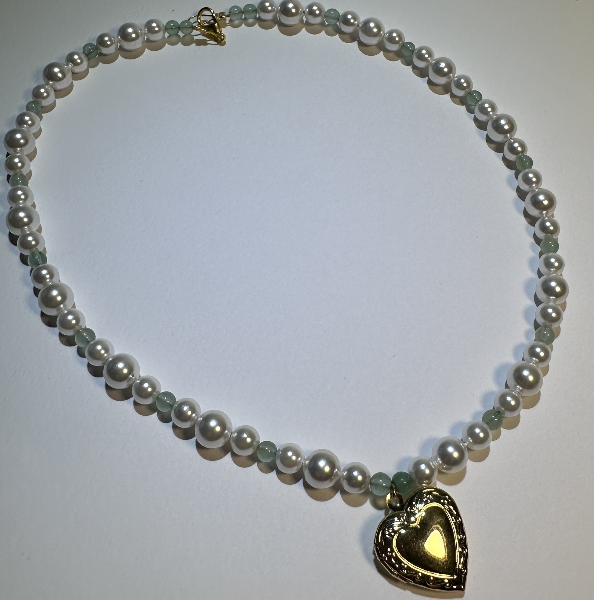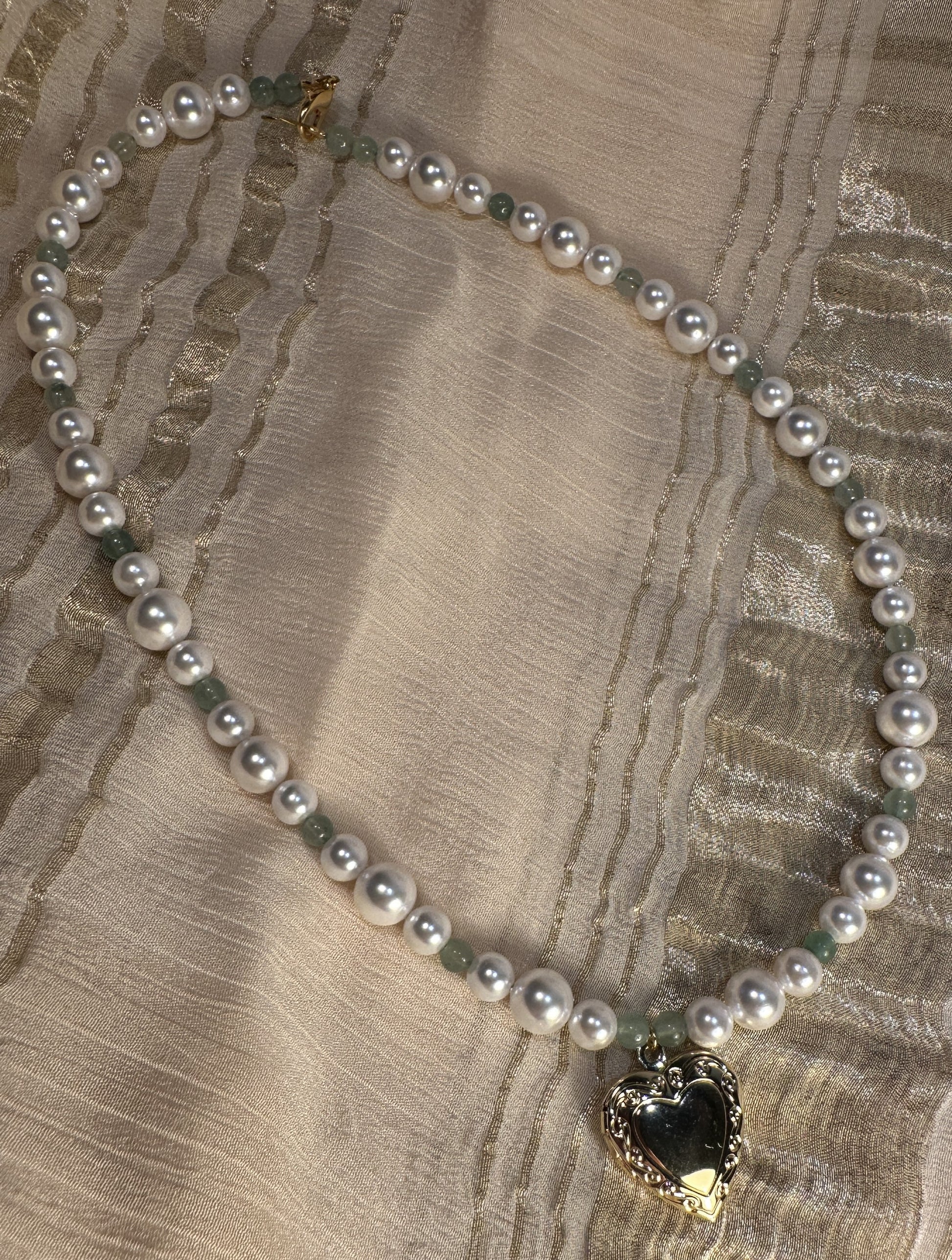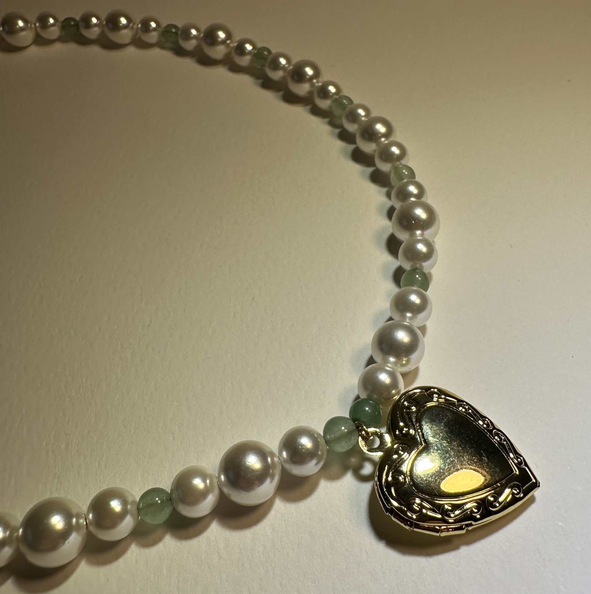 Κολιέ "Fiducia", ένα εξαίσιο χειροποίητο κολιέ που ενσαρκώνει τον ρομαντισμό και την κομψότητα. Διακοσμημένο με αληθινά μαργαριτάρια και λεπτές πράσινες χάντρες Αβεντουρίνη, αυτό το κομμάτι αιχμαλωτίζει την ουσία της διαχρονικής ομορφιάς. Το επίχρυσο μενταγιόν σε σχήμα καρδιάς προσθέτει μια πινελιά κλασικής γοητείας, συμβολίζοντας την αγάπη και την εμπιστοσύνη. Είτε ντύνεστε για μια ειδική περίσταση είτε προσθέτετε μια πινελιά κομψότητας στην καθημερινή σας εμφάνιση, το "Fiducia" είναι το τέλειο αξεσουάρ για να εκφράσετε τη ρομαντική σας πλευρά.