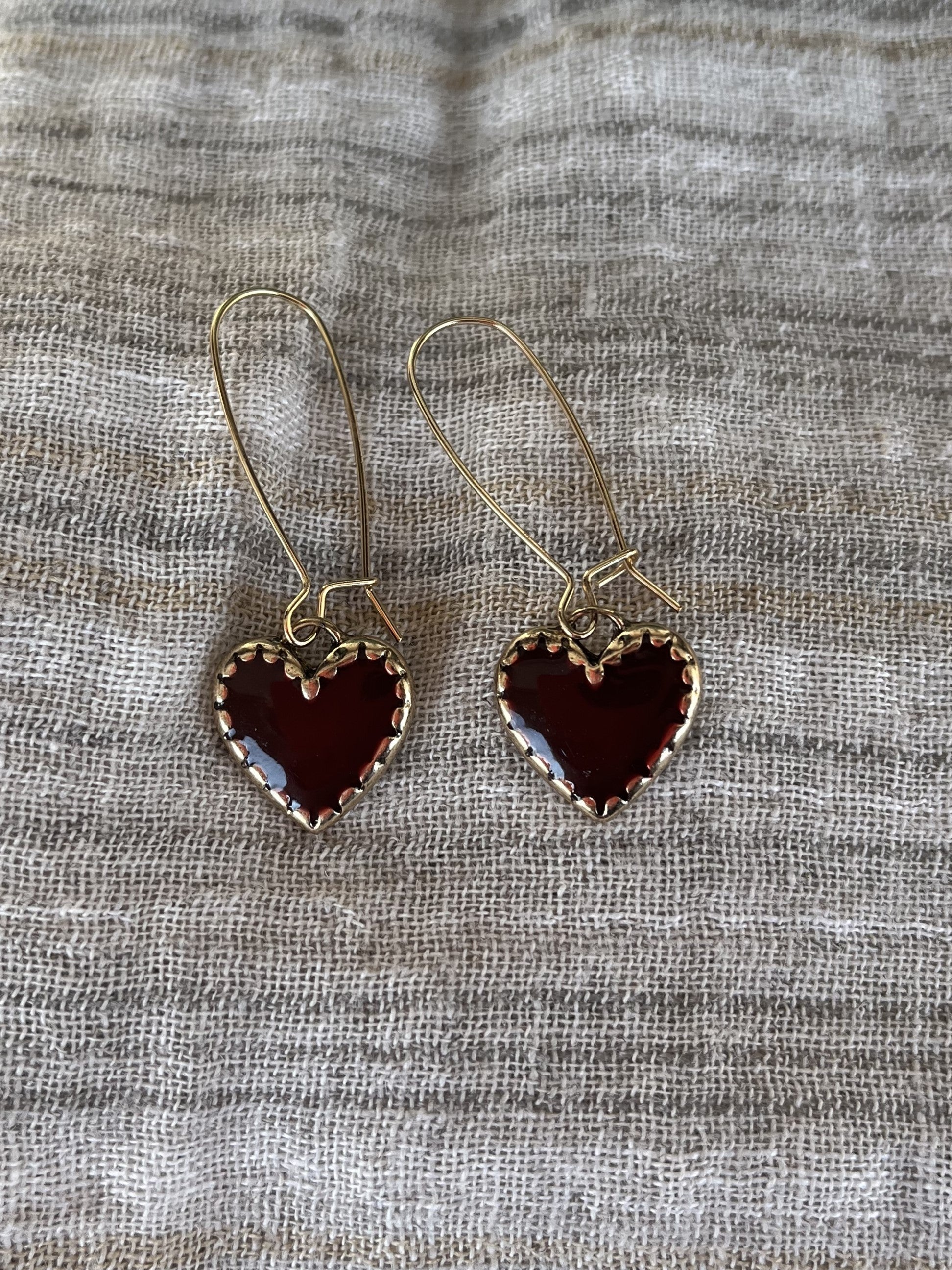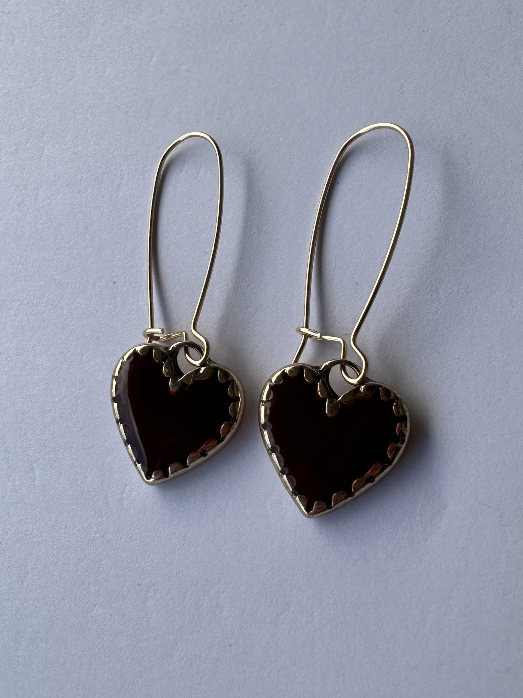 Αυτά τα υπέροχα σκουλαρίκια διαθέτουν κομψές καρδιές σε σκούρο κόκκινο χρώμα, που συμπληρώνονται από εξαιρετική χρυσή μεταλλική σύσταση. Η γυαλιστερή τους επιφάνεια και ο λεπτός σχεδιασμός τους κάνουν ιδανική επιλογή για κάθε ντύσιμο, ιδανικά για καθημερινή χρήση ή ειδικές περιστάσεις.