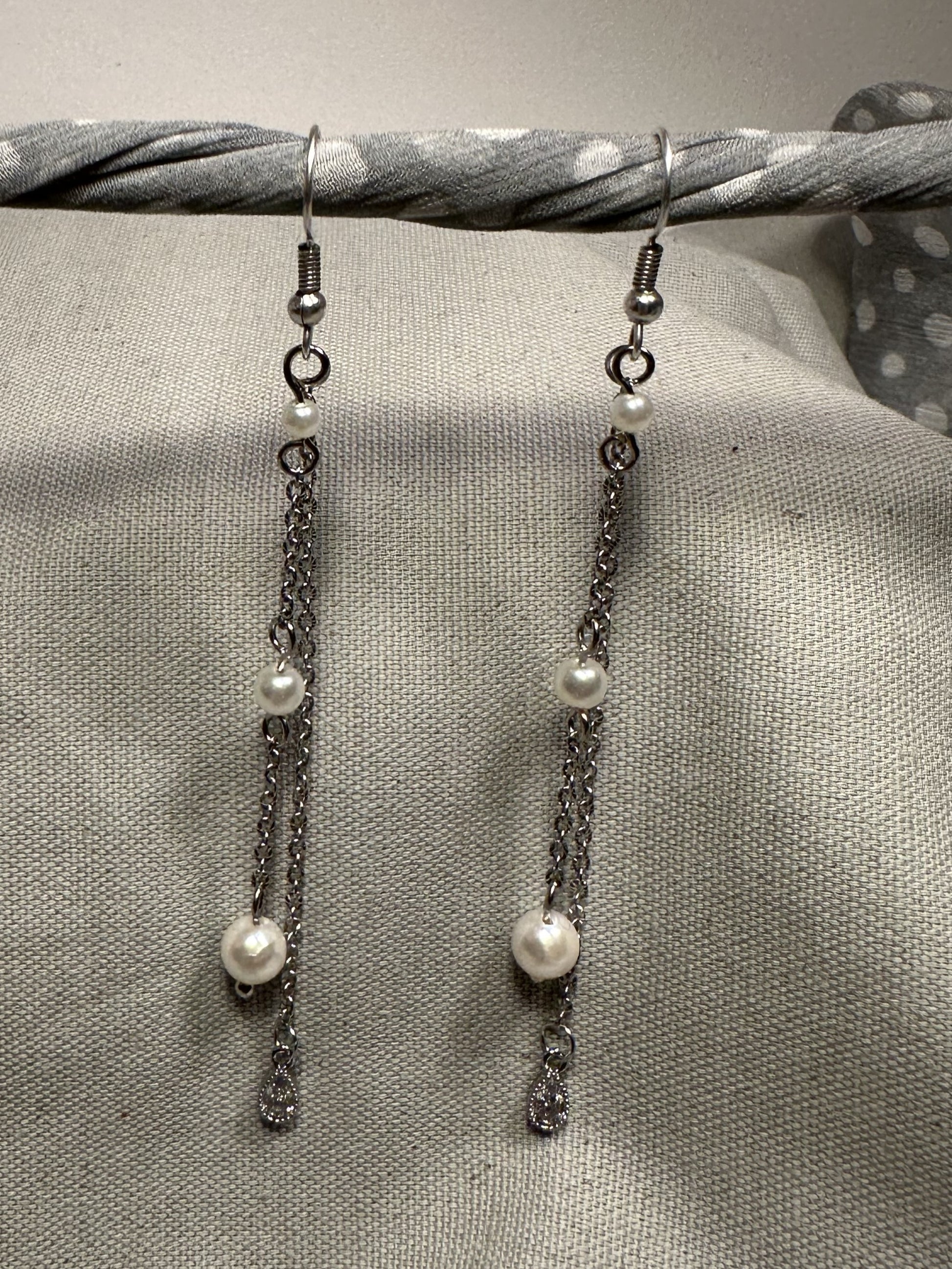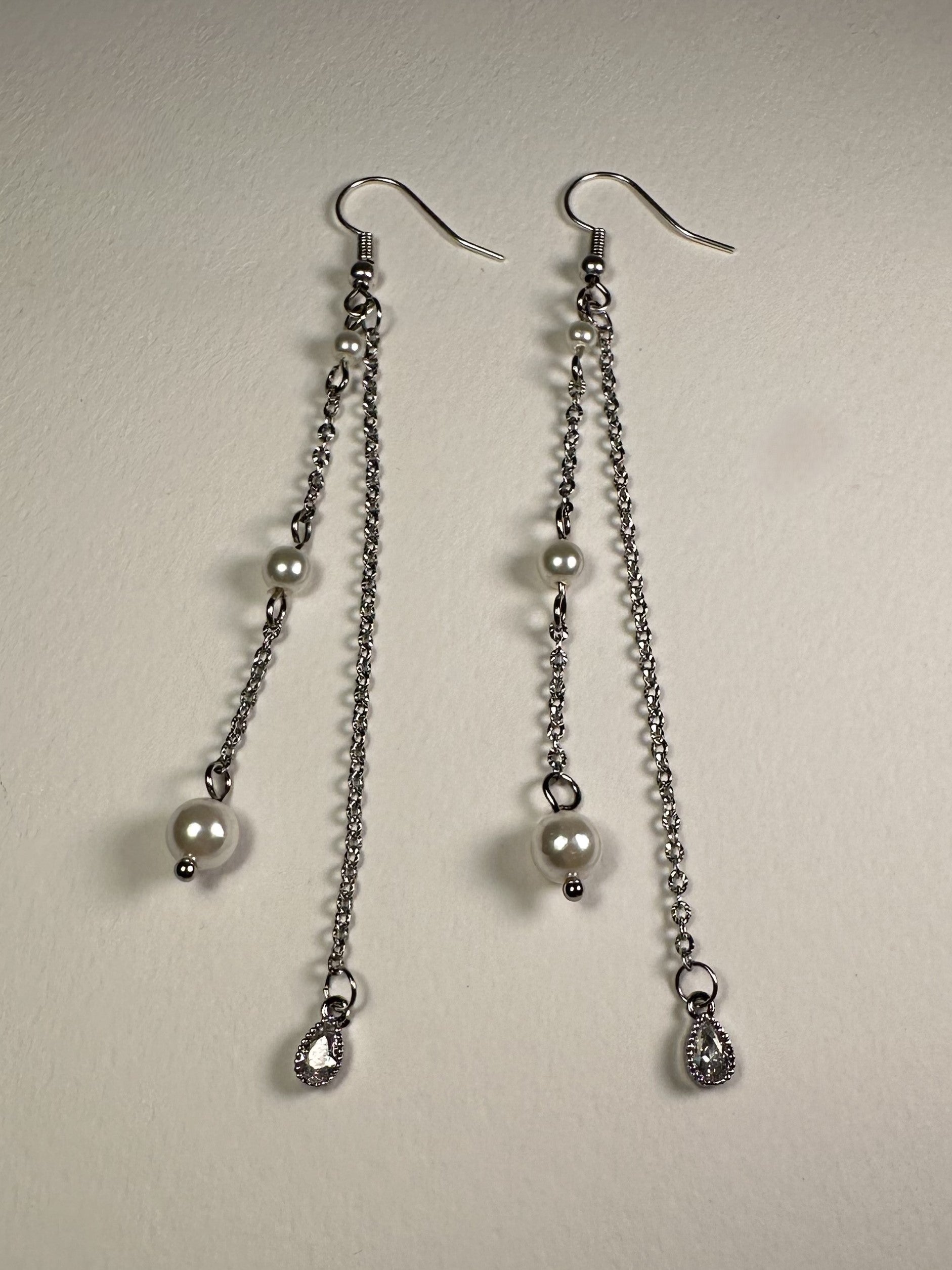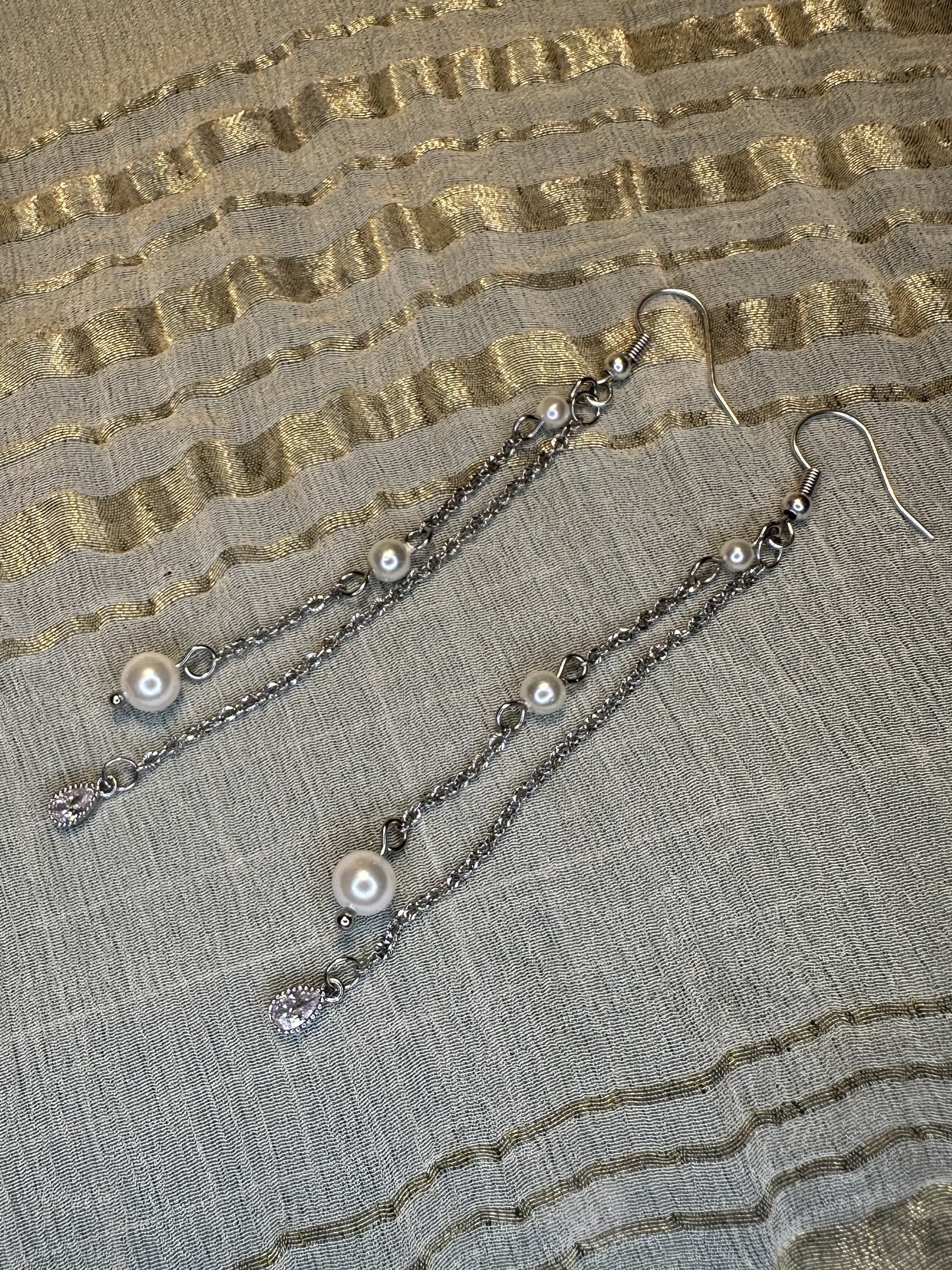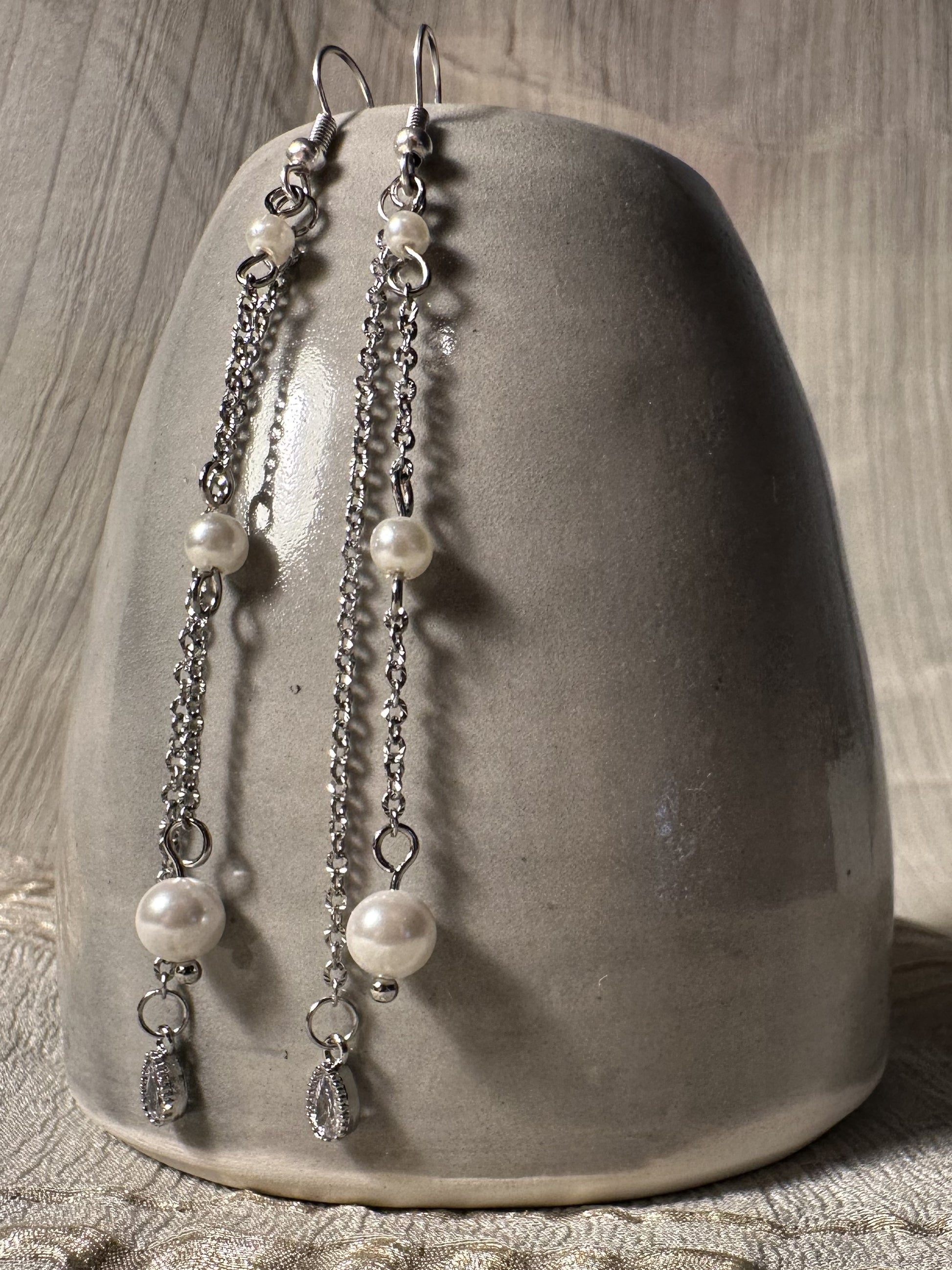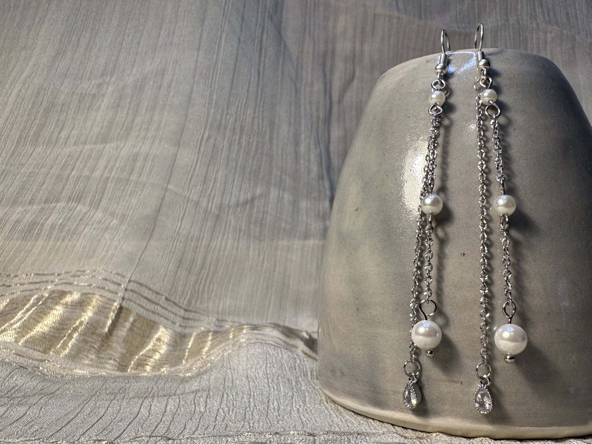 Λεπτομέρεια Σταγόνας: Ένα κομψό, μεταλλικό στοιχείο σε σχήμα σταγόνας στο τέλος της αλυσίδας ολοκληρώνει την εμφάνιση, προσθέτοντας μια διακριτική λάμψη που συμπληρώνει τέλεια τα μαργαριτάρια.